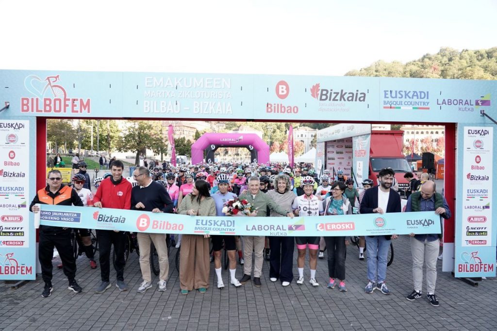 Una promoción del ciclismo femenino que fue un éxito, tal y como pudieron comprobar las autoridades institucionales. Leixuri Arriazabalaga, Diputada Foral de Bizkaia de Euskera, Cultura y Deporte, acompañada por Carlos Sergio, Director General de Deporte de la Diputación Foral de Bizkaia; Gorka Iturriaga, Director de Actividad Física y Deporte del Gobierno Vasco; Álvaro Parro, Responsable de Comunicación y Acción Social en Bizkaia de LABORAL Kutxa; y Joseba Agirre, de Bilbao Kirolak (Ayuntamiento de Bilbao) compartieron el corte de cinta oficial con Manu Gómez, presidente de la Federación Bizkaina; Andoni Madariaga, vicepresidente de la Fundación Euskadi, representantes de la Comisión de Mujeres de la Federación; Joane Somarriba, embajadora del equipo LABORAL Kutxa-Euskadi y madrina del evento y que fue homenajeada en la salida, y Ziortza Villa, ciclista de ultrafondo.