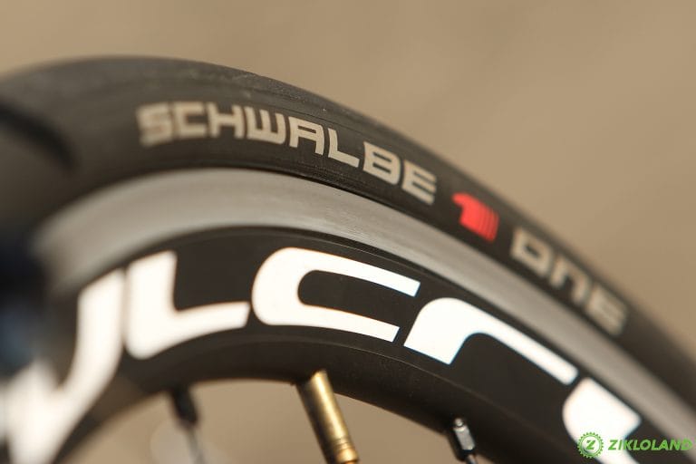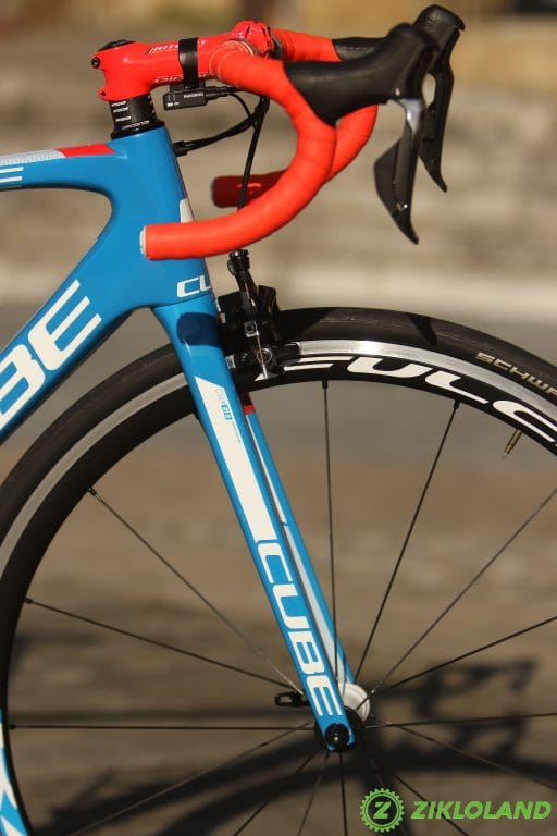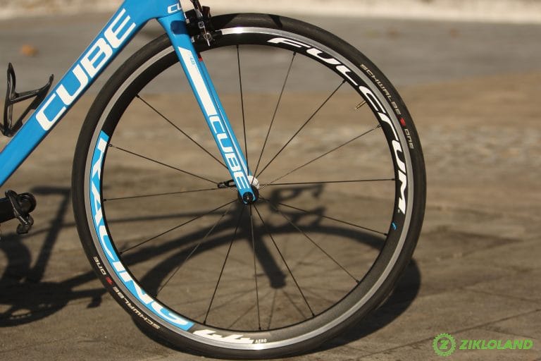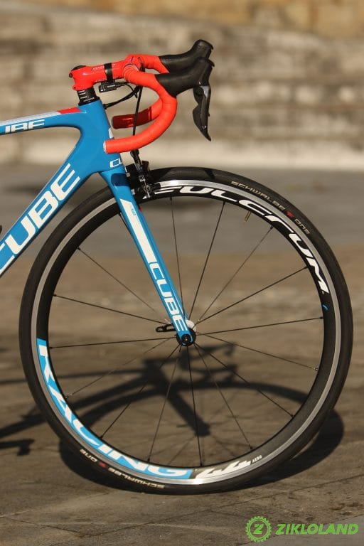 En una bicicleta el componente que más puede “vestir” son las ruedas, Cube ha optado por las Fulcrum Racing 44 Aero, QR/QR. Un modelo preparado para el modelo Litening C:68 SL con colores acordes a la bicicleta. Son fiables y para rodar sin preocupaciones, quizá no son las ruedas más ligeras pero vemos que han querido tener unas ruedas fiables antes que apurar la ligereza y perder esa seguridad y aerodinámica que nos da el perfil de 44mm. De la mano de las ruedas Fulcrum para no perder “grip”, rodar seguro y sin riesgo de pinchazo la bicicleta nos trae montadas las cubiertas Schwalbe One, Kevlar, 25-622. Esta marca norteamericana de cubiertas y tubulares es una de las más vendidas en el mercado debido a su relación entre la durabilidad, poca resistencia en el rodar y agarre en curva.