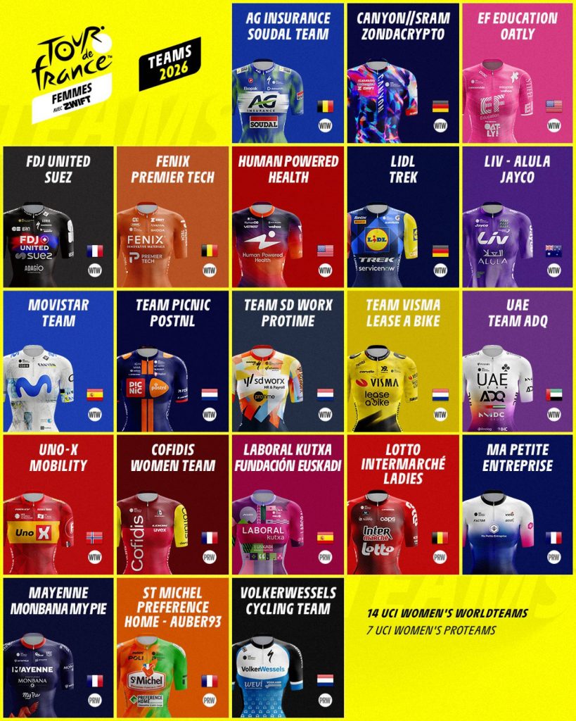 La Unión Ciclista Internacional debe reflexionar sobre lo que viene sucediendo en el ciclismo masculino e incluso en mayor medida en el ciclismo femenino. Los costes están disparados y cada vez hay menos equipos en el pelotón que puedan asumir los gastos de estar en la elite. En el caso del ciclismo femenino vemos un claro ejemplo con la nómina de equipos invitados al Tour de Francia de 2026.