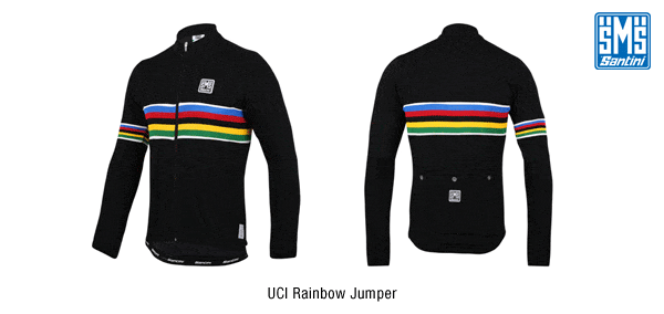 El maillot arcoíris es uno de los símbolos más reconocibles en el mundo del ciclismo y ponérselo es un objetivo y un sueño, un objeto de deseo por el que sufrir. Santini, que forma parte de la UCI (Unión Ciclista Internacional) desde 1988, ha desarrollado una colección dedicada a 5 colores del arcoíris que derivan de los anillos olímpicos: azul, rojo, negro, amarillo y verde.