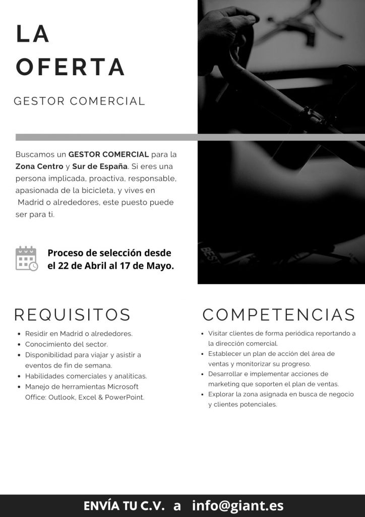 Giant Ibérica, fabricante número uno mundial en bicis y accesorios, ofrece un puesto de gestor para la zona Centro y Sur de España.