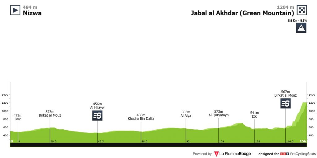 El Tour de Omán ofrece hoy la quinta y decisiva jornada de 2026, con salida en Nizwa y meta en Jabal al Akhdar (Green Mountain), un puerto de 5,8 kilómetros al 9,9% de pendiente media. Es el día clave para el desenlace de la carrera 2.Pro.