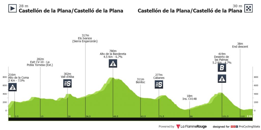 La prueba para corredores júnior arranca con una jornada que tiene como salida y meta la ciudad de Castellón y que obligará a los jóvenes talentos a ascender el alto de La Bandereta (2ª) y el Desierto de las Palmas (2ª), situado a apenas 15 kilómetros del final.
